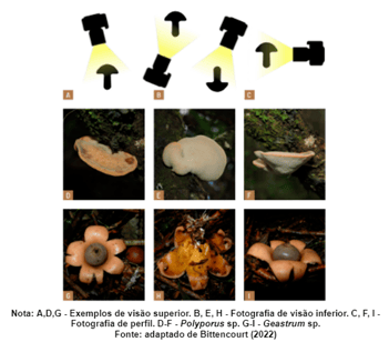 Imagens fotográficas dos macrofungos foram capturadas utilizando equipamentos como iPhone 11 e câmera profissional. A preparação do cenário e iluminação foram ajustadas para destacar os detalhes dos basidiomas. Cada espécime foi fotografado de diferentes ângulos e com escala para precisão na visualização.