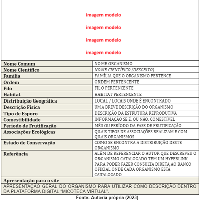 As informações dos macrofungos foram organizadas em tabelas antes de digitalizadas. Foram coletados dados como imagem, nome comum e científico, família, ordem, filo, habitat, distribuição geográfica, descrição física, tipo de esporo, comestibilidade, período de frutificação, associações ecológicas e estado de conservação. A apresentação para o site foi elaborada de forma didática para facilitar a compreensão pelo público geral.